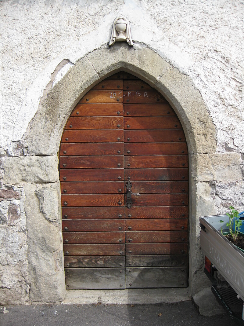 Late-Gothic church, closed under the reign of Emperor Joseph II in 1785, which was dedicated to the Irish abbot and itinerant monk Columba (d. 615). A chamfered, sandstone-framed pointed-arch portal on the ground floor of the west façade, two stone-framed rectangular windows at the sides and the large sandstone corner blocks (15th century) all recall the former church.